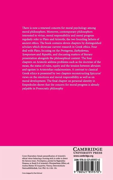 There is now a renewed concern for moral psychology among moral philosophers. Moreover, contemporary philosophers interested in virtue, moral responsibility and moral progress regularly refer to Plato and Aristotle, the two founding fathers of ancient ethics. The book contains eleven chapters by distinguished scholars which showcase current research in Greek ethics. Four deal with Plato, focusing on the Protagoras, Euthydemus, Symposium and Republic, and discussing matters of literary presentation alongside the philosophical content. The four chapters on Aristotle address problems such as the doctrine of the mean, the status of rules, equity and the tension between altruism and egoism in Aristotelian eudaimonism. A contrast to classical Greek ethics is presented by two chapters reconstructing Epicurus' views on the emotions and moral responsibility as well as on moral development. The final chapter on personal identity in Empedocles shows that the concern for moral progress is already palpable in Presocratic philosophy.
