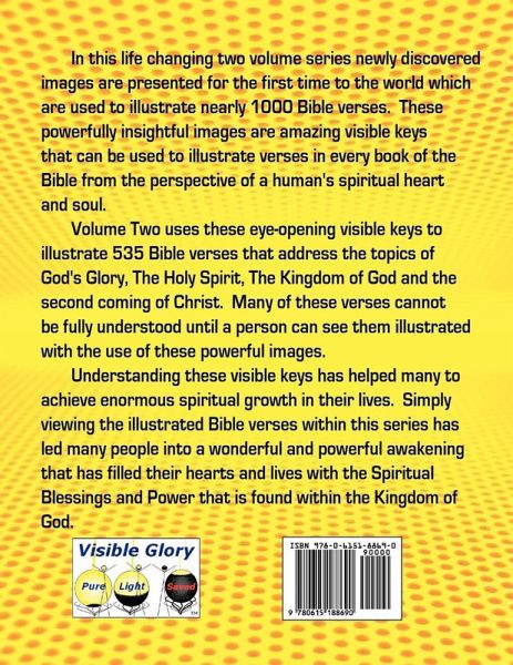 In this life changing two volume series newly discovered images are presented for the first time to the world that are used to illustrate nearly 1000 Bible verses. These powerfully insightful visible keys that can be used to illustrate verses in every book of the Bible from the perspective a human's spiritual heart and soul. Volume Two uses these eye-opening images to illustrate 535 Bible verses that address the topics of God's Glory, The Holy Spirit, The Kingdom of God and the second coming of Christ. Many of these verses cannot be fully understood until a person can see them illustrated with the use of these powerful images. Understanding these visible keys has helped many to achieve enormous spiritual growth in their lives. Simply viewing the illustrated Bible verses within this series has led many people into a wonderful and powerful spiritual awakening that has filled their hearts and lives with the Spiritual Blessings and Power that is found within the Kingdom of God.
