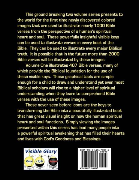 This ground breaking two volume series presents to the world for the first time newly discovered colored images that are used to illustrate nearly 1000 Bible verses from the perspective of a human's spiritual heart and soul. These powerfully insightful visible keys can be used to illustrate verses in every book of the Bible. They can be used to illustrate every major Biblical truth. These never seen before images are the visible keys, which transforms the Bible into a beautifully illustrated book from a spiritual point of view. Volume One illustrates 407 Bible verses many of which provide the Biblical foundation for the use of these visible keys. Simply viewing the Bible verses illustrated within this series has led many people into a powerful spiritual awakening that has filled their hearts and lives with the spiritual goodness and blessings found within the Kingdom of God.
