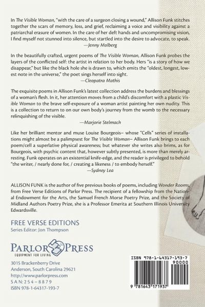 In The Visible Woman, Allison Funk writes of how women often disappear into the roles expected of them, becoming invisible to themselves. To fill in "the thin / chalk outline" of herself that she's "drawn and erased" for as long as she can remember, Funk returns to the anatomical model of "The Visible Woman" she left unassembled as a child. With poems rather than the kit's plastic organs and bones, she strives to "create a likeness / to embody herself." In her efforts at self-representation, the poet is guided by the visual artist Louise Bourgeois- her real-life model of a woman who proved that art gives us a way of recognizing ourselves. In The Visible Woman, "with the care of a surgeon closing a wound," Allison Funk stitches together the scars of memory, loss, and grief, reclaiming a voice and visibility against a patriarchal erasure of women. In the care of her deft hands and uncompromising vision, I find myself not stunned into silence, but startled into the desire to advocate, to speak. -Jenny Molberg In the beautifully crafted, urgent poems of The Visible Woman, Allison Funk probes the layers of the conflicted self: the artist in relation to her body. Hers "is a story of how we disappear," but like the black hole she is drawn to, which emits the "oldest, longest, lowest note in the universe," the poet sings herself into sight. -Cleopatra Mathis The exquisite poems in Allison Funk's latest collection address the burdens and blessings of a woman's flesh. In it, her attention moves from a child's discomfort with a plastic Visible Woman to the brave self-exposure of a woman artist painting her own nudity. This is a collection to return to on our own body's journey from the womb to the necessary relinquishing of the visible. -Marjorie Stelmach Like her brilliant mentor and muse Louise Bourgeois- whose "Cells" series of installations might almost be a palimpsest for The Visible Woman- Allison Funk brings to each poem/cell a superlative physical awareness; but whatever she writes also brims, as for Bourgeois, with psychic content that, however subtly presented, is more than merely arresting. Funk operates on an existential knife-edge, and, the reader is privileged to behold "...the writer/ nearly done for, creating a likeness/ to embody herself."-Sydney Lea Allison Funk is the author of five previous books of poems, including Wonder Rooms, from Free Verse Editions of Parlor Press. The recipient of a fellowship from the National Endowment for the Arts, the Samuel French Morse Poetry Prize, and the Society of Midland Authors Poetry Prize, she is a Professor Emerita at Southern Illinois University Edwardsville.