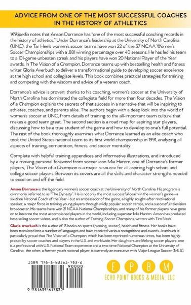 Wikipedia notes that Anson Dorrance has "one of the most successful coaching records in the history of athletics." Under Dorrance's leadership at the University of North Carolina (UNC), the Tar Heels women's soccer teams have won 22 of the 37 NCAA Women's Soccer Championships with a .881 winning percentage over 40 seasons. He has led his team to a 101-game unbeaten streak and his players have won 20 National Player of the Year awards. In The Vision of a Champion, Dorrance teams up with bestselling health and fitness writer Gloria Averbuch to deliver a transformational guide to developing soccer excellence at the high school and collegiate levels. This book combines practical strategies for training and competing with the wisdom and advice of a veteran coach. Dorrance's advice is proven: thanks to his coaching, women's soccer at the University of North Carolina has dominated the collegiate field for more than four decades. The Vision of a Champion explains the secrets of that success in a narrative that is inspiring to athletes, coaches, and parents alike. The authors begin with a deep look into the world of women's soccer at UNC, from details of training to the all-important team culture that makes a good team great. The second section is a road map for aspiring star players: it discusses how to be a true student of the game and how to develop to one's full potential. The remainder of the book thoroughly examines what Dorrance learned as an elite coach who took the United States national team to its first world championship in 1991, analyzing all aspects of training, competition, fitness, and soccer mentality. Complete with helpful training appendices and informative illustrations, Dorrance and Averbuch's book is introduced with a moving personal foreword by soccer icon Mia Hamm, one of Dorrance's former players, The Vision of a Champion is a major resource for all aspiring high school and college soccer players; between its covers are all the skills and character strengths needed to excel on and off the field.