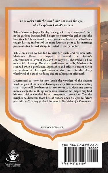 Love looks with the mind, but not with the eye... which explains Cupid's success When Baron Jasper Henley is caught kissing a marquess' niece in the gardens during a ball, he agrees to marry the girl. It's not the first time he's been forced to marry-he and his late wife had been caught kissing in front of the same fountain prior to his marriage proposal-but he had always intended to marry Sophie. While on a visit to London to visit her uncle and his new wife, Marianne Slater is happy to attend the Season's entertainments-even if she can't see very well. The world is a blur unless it's close-up. Usually a wallflower at balls, Marianne is stunned when a gentleman approaches and offers to escort her in the gardens. A clear-eyed innocent kiss suddenly results in the blurry whirlwind of a quick wedding and its subsequent aftermath. Determined to show his new bride the wonders of the ancient world as part of his next archaeological expedition-their wedding trip-Jasper will do whatever it takes to see to it Marianne can see more clearly. But as things come into focus for her, Jasper may find his own vision clouded by an unexpected revelation. Can the insights he discovers from bits of history open his eyes to future possibilities? He may prefer blindness in The Vision of a Viscountess.