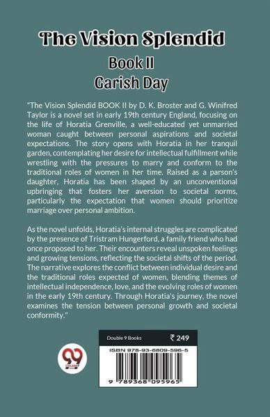 The Vision Splendid BOOK II by D. K. Broster and G. Winifred Taylor is a novel set in early 19th century England, focusing on the life of Horatia Grenville, a well-educated yet unmarried woman caught between personal aspirations and societal expectations. The story opens with Horatia in her tranquil garden, contemplating her desire for intellectual fulfillment while wrestling with the pressures to marry and conform to the traditional roles of women in her time. Raised as a parson's daughter, Horatia has been shaped by an unconventional upbringing that fosters her aversion to societal norms, particularly the expectation that women should prioritize marriage over personal ambition. As the novel unfolds, Horatia's internal struggles are complicated by the presence of Tristram Hungerford, a family friend who had once proposed to her. Their encounters reveal unspoken feelings and growing tensions, reflecting the societal shifts of the period. The narrative explores the conflict between individual desire and the traditional roles expected of women, blending themes of intellectual independence, love, and the evolving roles of women in the early 19th century. Through Horatia's journey, the novel examines the tension between personal growth and societal conformity.