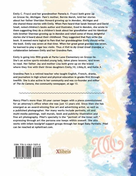 Emily C. Frucci and her grandmother Pamela A. Frucci both grew up on Grosse Ile, Michigan. Pam's mother, Bernie Marsh, told her stories about her father Sheridan Howard growing up in Mendon, Michigan and she shared these stories with Emily. When Pam heard that Sarah Stewart and David Small, noted children's books author and illustrator, lived in Mendon, she wrote to them suggesting they do a children's book about her grandfather and his identical twin brother Sherman growing up in Mendon and retell some of those delightful stories she'd heard about their childhood. They suggested that Pam write the book. It seemed more logical to Pam that her granddaughter Emily should write the book. Emily was seven at that time. When her great great grandpa was seven, he learned to play a cigar box violin. Thus A Visit to My Great Great Grandpa, a collaboration between Emily and her Grandma Pam. Emily is going into fi fth grade at Parke Lane Elementary on Grosse Ile. She's an active sports-minded young lady, takes piano lessons, and loves to read. Her father Jay and mother Lisa both grew up on the Island where they live with their three daughters Emily,10, Libby,8, and Katie,5. Grandma Pam is a retired teacher who taught English, French, drama, and journalism in high school and physical education in grades fi rst through twelfth. She is also active in her community and was co-founder and editor of The Ile Camera, the community newspaper, at age 13.