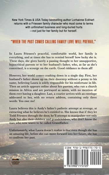 New York Times & USA Today bestselling author Lorhainne Eckhart returns with a Friessen family character who must come to terms with unfinished business and long-buried hurts-not just for her family but for herself. She'd never even invited him in.The man had walked in and taken over, still ordering her around, and what had she done? Nothing. She'd shrunk back into that young woman without a voice. In Laura Friessen's peaceful, comfortable world, her family is everything, and at times she has to remind herself how lucky she is. These days, she gives barely a passing thought to her unsupportive, hypocritical parents or to her husband's father, who, as far as she's concerned, is a scourge on the earth. Good riddance to them all! However, her world comes crashing down in a single day. First, her husband's father shows up on their doorstep without a penny to his name, believing Laura is solely responsible for his misfortune in life. Then an article appears online about her parents, who run a church mission in Africa and are portrayed as saints, with no mention of them ever having a daughter. Last, a courier arrives with an envelope addressed to her, with no return address, containing only three words: You owe me! Laura believes this is Andy's father's pathetic attempt at revenge, at extracting what he believes he's entitled to. She knows that if they let Todd Friessen through the door, he'll attempt to manipulate not only Andy but also their children and grandchildren, who don't know the man who now wants to be called Grandfather. Unfortunately, what Laura doesn't realize is that even though she has an amazing life, before she can move forward into her future, she has to confront her past.