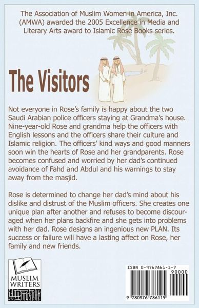 Book Description Not everyone in Rose's family is happy about the two Saudi Arabian police officers staying at Grandma's house. Nine-year-old Rose and grandma help the officers with English lessons and the officers share their culture and Islamic religion. The officers' kind ways and good manners soon win the hearts of Rose and her grandparents. Rose becomes confused and worried by her dad's continued avoidance of Fahd and Abdul and his warnings to stay away from the masjid. Rose is determined to change her dad's mind about his dislike and distrust of the Muslim officers. She creates one unique plan after another and refuses to become discouraged when her plans backfire and she gets into problems with her dad. Rose designs an ingenious new PLAN. Its success or failure will have a lasting affect on Rose, her family and new friends. The Association of Muslim Women in America, Inc. (AMWA) selected Linda D. Delgado to receive the Excellence in Media, Literary Arts award. The award is based on her work as author of the children's book series, "Islamic Rose Books". The Visitors is the first book in this series.