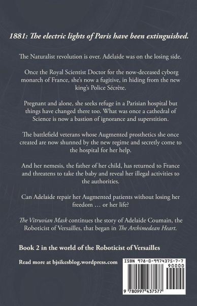 1881: The electric lights of Paris have been extinguished. The Naturalist revolution is over. Adelaide was on the losing side. Once the Royal Scientist Doctor for the now-dead cyborg monarchs of France, she's now a fugitive, hiding from the new king's Police Sécrète. Pregnant and alone, she seeks refuge in a Parisian hospital but things have changed there too. What was once a cathedral of Science is now a bastion of ignorance and superstition. The battlefield veterans whose Augmented prosthetics she once created are shunned by the new regime and come to the hospital for her help. But her nemesis, the father of her child, has returned to France and threatens to reveal her illegal activities to the authorities. Can Adelaide repair her Augmented patients without losing her freedom ... or her life? The Vitruvian Mask continues the story of Adelaide Coumain, the Roboticist of Versailles, that began in The Archimedean Heart.