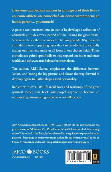 Master Power Attitudes and Become an Icon Everyone can become an icon in any aspect of their lives - an iconic athlete, an iconic chef, an iconic entrepreneur, an iconic parent... you name it! A person can transform into an icon if he develops a collection of admirable attitudes over a period of time. Taking the great Swami Vivekananda as the role model, The Vivekananda Way presents attitudes in seven opposing pairs that can be adopted to radically change our lives and make us all icons in our chosen fields. These attitudes are paired specifically to help expand our inner and outer worlds and achieve a true balance between them. The author, ARK Sarma, emphasizes the difference between 'vision' and 'seeing the big picture' and shows the way forward to developing the traits that shape a great personality. Replete with over 108 life incidences and teachings of the great spiritual leader, this book will propel anyone to become an outstanding human being and achieve overall success. ARK Sarma is an engineer and ex-UPSC Class-I officer. He has also worked in the private sector as Additional Vice President with Tata Teleservices Ltd. After a long stint of 15 years with the Tatas, he bade farewell to a regular job to pursue his other passions - becoming an entrepreneur and author. He has written over 20 books on Swami Vivekananda and sold over eight lakh copies in several languages.