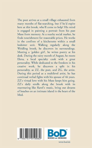 The poet arrives at a small village exhausted from many months of flat-searching, but if he'd expire here at this brook, who'll come to help? His mind is engaged in painting a portrait from his past Muse from memory. At a nearby social market, he finds nourishment for reasonable prices. He works in the confines of a kitchenette within a small bedsitter unit. Walking regularly along the Weidling brook, he discovers its surroundings. Meeting a 'golden girl', he writes poetry at his desk. During the rainy month of August, he meets Elena, a local specialty cook with a great personality. While dedicated to the freedom in his creative work, he discovers a split in his personality, as ZZ, the poet, and ZG, the artist. During this period as a multilevel artist, he has continual verbal fights with his spouse of 46 years. ZZ's virtual love with his Muse keeps him going. ZZ's daily strolls along the brook with its murmuring like Ravel's music, bring out dreams of beaches on an intimate island in the heart of the Med.