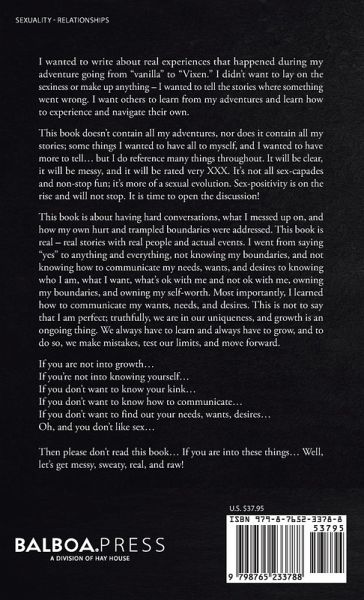 "I wanted to write about real experiences that happened during my adventure going from "vanilla" to "Vixen." I want others to learn from my adventures through the lessons I present, to have better experiences and help navigate their own sexuality. This book will be honest, it will be messy, and it will be rated very XXX. It's not all sex-capades and non-stop fun; it's more of a sexual evolution. Sex-positivity is on the rise and it's time to open the discussion! This book is about the hard conversations, what I messed up on, and how my own hurt and trampled boundaries were addressed. I went from not knowing my boundaries, not knowing how to communicate my needs, wants, and desires to knowing who I am, what I want, what's ok with me and not ok with me, owning my boundaries, and owning my self-worth. This is not to say that I am perfect; we are all unique, and growth is an ongoing process. We are always learning and growing, and in order to do so, we make mistakes, test our limits, and move forward. If you are not into growth, self-inquiry, open and honest communication, sexuality, kink and exploration, then please don't read this book. If you are into these things, then let's get messy, sweaty, real and raw!"
