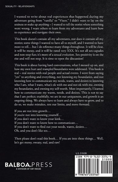 "I wanted to write about real experiences that happened during my adventure going from "vanilla" to "Vixen." I want others to learn from my adventures through the lessons I present, to have better experiences and help navigate their own sexuality. This book will be honest, it will be messy, and it will be rated very XXX. It's not all sex-capades and non-stop fun; it's more of a sexual evolution. Sex-positivity is on the rise and it's time to open the discussion! This book is about the hard conversations, what I messed up on, and how my own hurt and trampled boundaries were addressed. I went from not knowing my boundaries, not knowing how to communicate my needs, wants, and desires to knowing who I am, what I want, what's ok with me and not ok with me, owning my boundaries, and owning my self-worth. This is not to say that I am perfect; we are all unique, and growth is an ongoing process. We are always learning and growing, and in order to do so, we make mistakes, test our limits, and move forward. If you are not into growth, self-inquiry, open and honest communication, sexuality, kink and exploration, then please don't read this book. If you are into these things, then let's get messy, sweaty, real and raw!"