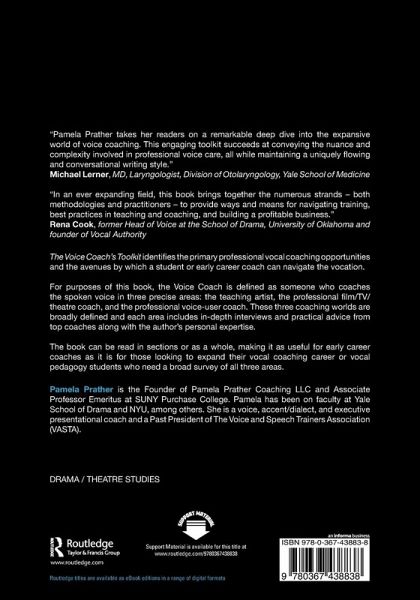 "The Voice Coach's Toolkit by Pamela Prather is an invaluable resource for new and established voice, speech and dialect coaches who want to build a career. In an ever expanding field, this book brings together the numerous strands - both methodologies and practitioners - to provide ways and means for navigating training, best practices in teaching and coaching, and building a profitable business." - Rena Cook, former Head of Voice at the School of Drama, University of Oklahoma and founder of Vocal Authority