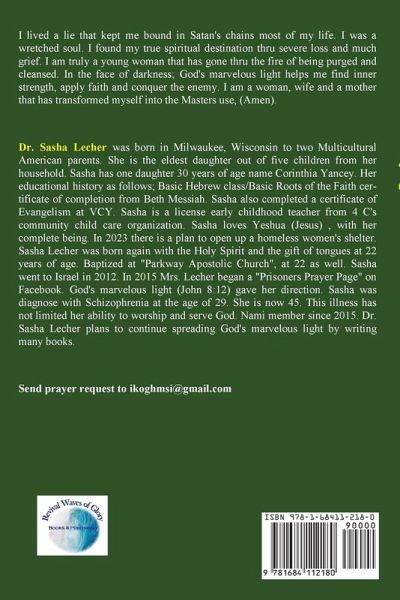 I lived a lie that kept me bound in Satan's chains most of my life. I was a wretched soul. I found my true spiritual destination thru severe loss and much grief.. I am truly a young woman that has gone through the fire of being purged and cleansed. In the face of darkness, God's marvelous light helps me find inner strength, apply faith and conquer the enemy. I am a young woman and a mother that has transformed myself into the masters use; (Amen).