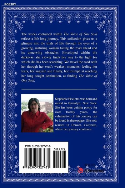 The works contained within The Voice of One Soul reflect a life-long journey. This collection gives us a glimpse into the trials of life through the eyes of a growing, maturing woman facing the road ahead and its unnerving obstacles. Enveloped within the darkness, she slowly finds her way to the light for which she has been searching. We travel the road with her through her soul's weakest moments, feeling her fears, her anguish and finally, her triumph at reaching her long sought destination, at finding The Voice of One Soul.