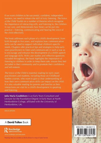 If we want children to be successful, confident, independent learners, we need to relearn the skill of truly listening. The Voice of the Child builds on a number of theories which recognise the importance of interacting with, and listening, to the children in our care, and demonstrates how these can be put into practice - listening, communicating and hearing the voice of the child effectively. The book addresses each phase of a child's development, from birth through to five years, and explains how communication skills can be used to support individual children's specific needs. Chapters offer practical tips and strategies to help early years practitioners to listen and communicate in such a way as to encourage and enhance the development of a child's speech and language skills. With case studies and reflective questions included throughout, the book highlights the importance of listening to children in order to keep them safe, ensure they feel included in their community, and to promote their confidence and self-esteem. The Voice of the Child is essential reading for early years practitioners and students, including those on Childhood Studies courses, who want to gain a clear understanding of how their own communication skills can impact on the child.