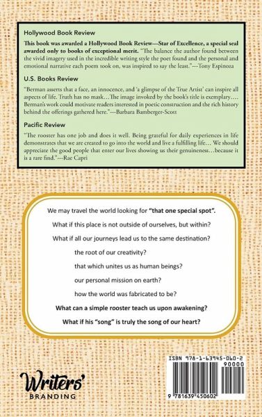 We may travel the world looking for "that one special spot". What if this place is not outside of ourselves, but within? What if all our journeys lead us to the same destination? the root of our creativity? that which unites us as human beings? our personal mission on earth? how the world was fabricated to be? What can a simple rooster teach us upon awakening? What if his "song" is truly the song of our heart? ¿-------------------------------------------------------------------------------------------------------------------------------------------------- Hollywood Book Review This book was awarded a Hollywood Book Review-Star of Excellence, a special seal awarded only to books of exceptional merit. "The balance the author found between the vivid imagery used in the incredible writing style the poet found and the personal and emotional narrative each poem took on, was inspired to say the least."---Tony Espinoza U.S. Books Review "Berman asserts that a face, an innocence, and 'a glimpse of the True Artist' can inspire all aspects of life. Truth has no mask...The image invoked by the book's title is exemplary....Berman's work could motivate readers interested in poetic construction and the rich history behind the offerings gathered here."---Barbara Bamberger-Scott Pacific Review "The rooster has one job and does it well. Being grateful for daily experiences in life demonstrates that we are created to go into the world and live a fulfilling life... We should appreciate the good people that enter our lives showing us their genuineness...because it is a rare find."---Rae Capri