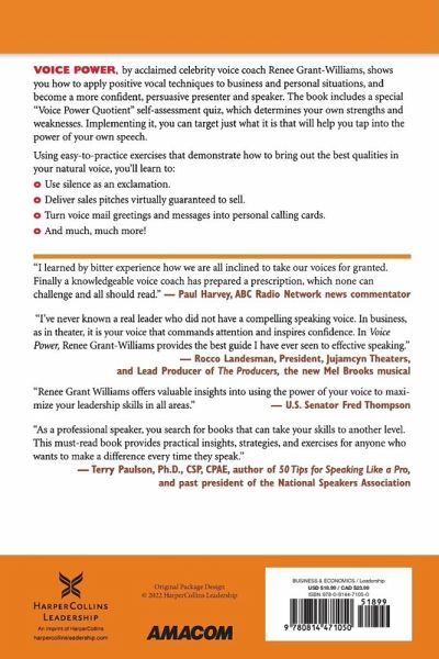 "Ever wonder what makes us buy from a certain salesperson or prefer one TV news announcer over another? In each case, a human voice is subtly captivating our ear and commanding our attention. Now celebrity voice coach Renee Grant-Williams reveals the trade secrets behind those persuasive voices and shows readers how to apply positive vocal techniques to business and personal situations. Much more than a guide to proper breathing or voice projection, this is a life-altering ""owner's manual"" to unleashing and directing the powers of communication within one's speaking voice. By exploring the rich connections between singing and speaking, Grant-Williams helps readers: * Evaluate their ""VoicePower"" quotients * Literally breathe new life into their voices * Tap the amazing power of consonants--and silence * Deliver sales pitches virtually guaranteed to sell * Turn a voice mail message (incoming or outgoing) into a personal calling card * Become more confident, persuasive presenters and public speakers."