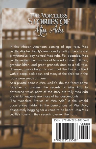 In this African American coming of age tale, Miss Lucille stirs her family's emotions by telling the story of a mysterious lady named Miss Ada. For decades, Miss Lucille recited the narrative of Miss Ada to her children, grandchildren, and great-grandchildren as a folk tale. However, rumors began to swirl that the tale was filled with a deep, dark past, and many of the children in the room were seeds of them. At a pivotal point in Miss Lucille's life, the family came together to uncover the secrets of Miss Ada, to determine which parts of the story are truly Miss Ada and which aspects are those of her descendants. "The Voiceless Stories of Miss Ada" is the untold occurrences hidden in the generations of Miss Ada, desperately begging for a voice to be heard. Join Miss Lucille's family in their search to unveil the truth. The Voiceless Stories of Miss Ada is an African American tale that narrates the author's true genealogy of hidden family secrets nestled into a mysterious fiction story. The terms "Voiceless Stories" refer to secrets that Miss Ada knew. The Voiceless Stories of Miss Ada introduces the truth of our African American history to young audiences without replanting seeds of hatred.