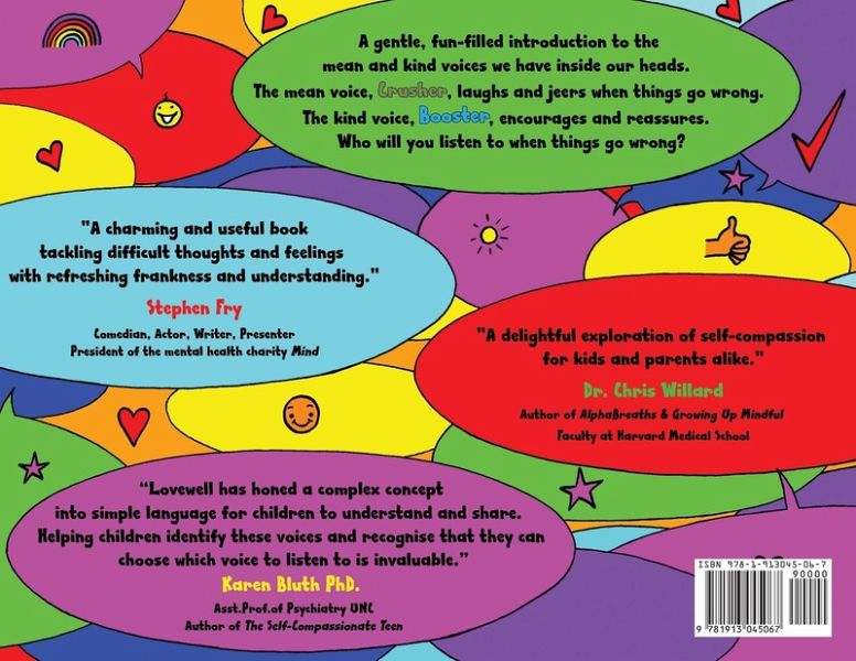 The Voices in My Head! has a unique approach to helping children understand the critical/mean and compassionate/kind voices 'inside their head'. It offers the opportunity for children (and their carers) to learn how to feel okay about themselves, even when things go wrong. Young readers see how differently the two powerfully illustrated 'voices', Crusher (critical/mean voice) and Booster (compassionate/kind voice) respond to everyday difficulties the children may encounter. This debut children's book by best-selling author Kathryn Lovewell, is great fun to read, using comical expressions ("Arrgggh" I worry,"Flipperdeedear"!), rhyming text and wonderful characters and illustrations to engage its young readers, while delivering it's all-important message. The author is passionate about helping its readers (aged 6-99!) to develop self-kindness and self-compassion, which are pivotal to well-being and happiness. The Voices in My Head! guides children and parents alike to learn to pay attention to the kind voice in their head, so that they can feel safe and confident in who they are. By letting Booster be the clearest, strongest voice inside their heads, they can feel happy in their own skin. A colouring book is also available!