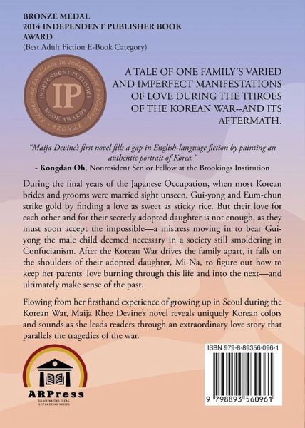 During the final years of the Japanese Occupation, when most Korean brides and grooms were married sight unseen, Gui-yong and Eum-chun strike gold by finding a love as sweet as sticky rice. But their love for each other and for their secretly adopted daughter is not enough, as they must soon accept the impossible-a mistress moving in to bear Gui-yong the male child deemed necessary in a society still smoldering in Confucianism. After the Korean War drives the family apart, it falls on the shoulders of their adopted daughter, Mi-Na, to figure out how to keep her parents' love burning through this life and into the next-and ultimately make sense of the past.Flowing from her firsthand experience of growing up in Seoul during the Korean War, Maija Rhee Devine's novel reveals uniquely Korean colors and sounds as she leads readers through an extraordinary love story that parallels the tragedies of the war.