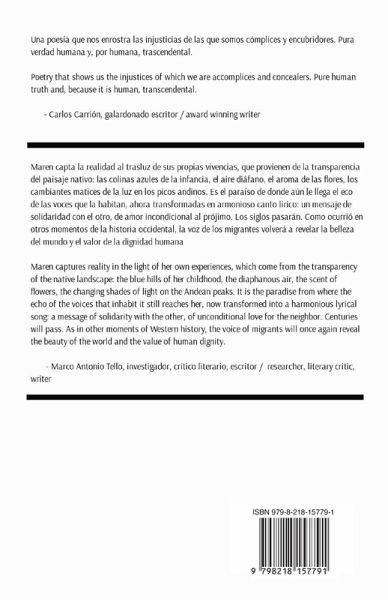 Maren Sofia Rogers is from Loja, Ecuador and has been living in the United States since 2004. She writes to cleanse her soul, to make sense of the nonsense, to find a reason for her life experience. To let the voices that inhabit her speak. Woman, Latina, mother, wife, daughter, immigrant. She is deeply moved by the human drama, by the search without answers, by the pain, the injustice, the willingness to close our eyes and ears before the destruction of mother earth, of innocent souls. But, she also writes to let in the light, to give wings to hope, to learn to be, to feel, to live. With the certainty that life is an ephemeral adventure, magical, marvelous, extraordinarily painful, brief. Maren Sofía Rogers' first bilingual collection of poems, "thevoices that inhabit me/las voces que me habitan " is an invitation to witness the author's journey through life with front row seats into her mind, heart, and soul. With absolute sincerity and vulnerability, Maren Sofía shares the vivid, colorful voices that inhabit her, immersing us in her world of words, images, rhythms, memories, dreams and desires. Every poem is a reflection, an introspection, a question and a quest to live with unwavering awe, gratitude, and acceptance. "Writing is for me an organic process, as vital and necessary as breathing. I write to heal the soul. The impulse comes from within and involves my whole body: the heart, liver, skin, muscles, blood. It is not a technical process or from the neck up. For me, life itself is poetry, and everyone who lives makes poetry. I find it and feel it in everyone and everything. And it is, has been and will continue to be my lifeline. By writing I discover and digest the fullness of life, not only in what is good and beautiful, but in everyone and everything: in our relationships, in our vocations, in our workplaces, in our daily lives... I invite you to read me, to give me the privilege of allowing my words to blossom in your mind."
