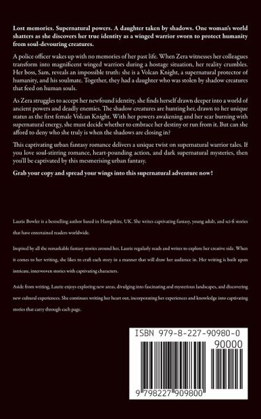 Lost memories. Supernatural powers. A daughter taken by shadows. One woman's world shatters as she discovers her true identity as a winged warrior sworn to protect humanity from soul-devouring creatures. A police officer wakes up with no memories of her past life. When Zera witnesses her colleagues transform into magnificent winged warriors during a hostage situation, her reality crumbles. Her boss, Sam, reveals an impossible truth: she is a Volcan Knight, a supernatural protector of humanity, and his soulmate. Together, they had a daughter who was stolen by shadow creatures that feed on human souls. As Zera struggles to accept her newfound identity, she finds herself drawn deeper into a world of ancient powers and deadly enemies. The shadow creatures are hunting her, drawn to her unique status as the first female Volcan Knight. With her powers awakening and her scar burning with supernatural energy, she must decide whether to embrace her destiny or run from it. But can she afford to deny who she truly is when the shadows are closing in? This captivating urban fantasy romance delivers a unique twist on supernatural warrior tales. If you love soul-stirring romance, heart-pounding action, and dark supernatural mysteries, then you'll be captivated by this mesmerising urban fantasy. Grab your copy and spread your wings into this supernatural adventure now!