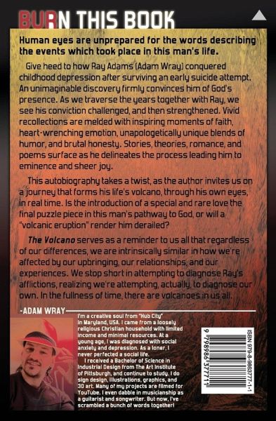 Burn this book! Human eyes are unprepared for the words describing the events which took place in this man's life. Give heed to how Ray Adams (Adam Wray) conquered childhood depression after surviving an early suicide attempt. An unimaginable discovery firmly convinces him of God's presence. As we traverse the years together with Ray, we see his conviction challenged, and then strengthened. Vivid recollections are melded with inspiring moments of faith, heart-wrenching emotion, unapologetically unique blends of humor, and brutal honesty. Stories, theories, romance, and poems surface as he delineates the process leading him to eminence and sheer joy. This autobiography takes a twist, as the author invites us on a journey that forms his life's volcano, through his own eyes, in real time. Is the introduction of a special and rare love the final puzzle piece in this man's pathway to God or will a "volcanic eruption" render him derailed? The Volcano serves as a reminder to us all that regardless of our differences, we are intrinsically similar in how we're affected by our upbringing, our relationships, and our experiences. We stop short in attempting to diagnose Ray's afflictions, realizing we're attempting, actually, to diagnose our own. In the fullness of time, there are volcanoes in us all.