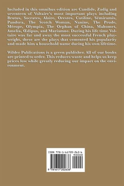 Included in this omnibus edition are Candide, Zadig and seventeen of Voltaire's most important plays including Brutus, Socrates, Alzire, Orestes, Catiline, Sémiramis, Pandora, The Scotch Woman, Nanine, The Prude, Mérope, Olympia, The Orphan of China, Mahomet, Amelia, ¿dipus, and Mariamne. During his life time Voltaire was far and away the most successful French playwright, these are the plays that cemented his popularity and made him a household name during his own lifetime. Wilder Publications is a green publisher. All of our books are printed to order. This reduces waste and helps us keep prices low while greatly reducing our impact on the environment.