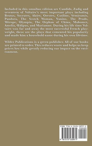 Included in this omnibus edition are Candide, Zadig and seventeen of Voltaire's most important plays including Brutus, Socrates, Alzire, Orestes, Catiline, Sémiramis, Pandora, The Scotch Woman, Nanine, The Prude, Mérope, Olympia, The Orphan of China, Mahomet, Amelia, ¿dipus, and Mariamne. During his life time Voltaire was far and away the most successful French playwright, these are the plays that cemented his popularity and made him a household name during his own lifetime.