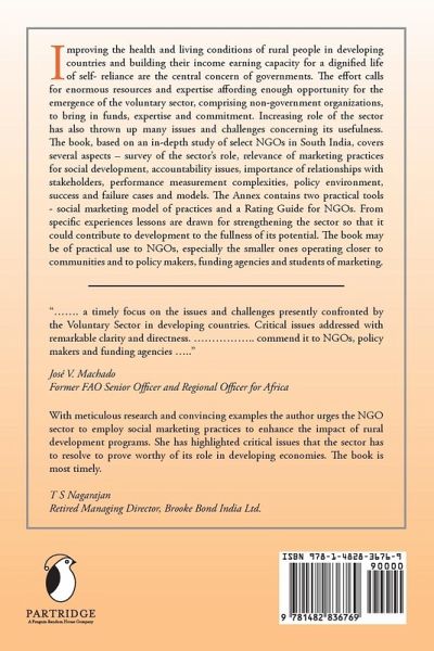 Improving the health and living conditions of rural people in developing countries and building their income earning capacity for a dignified life of self- reliance are the central concern of governments. The effort calls for enormous resources and expertise affording enough opportunity for the emergence of the voluntary sector, comprising non-government organizations, to bring in funds, expertise and commitment. Increasing role of the sector has also thrown up many issues and challenges concerning its usefulness. The book, based on an in-depth study of select NGOs in South India, covers several aspects - survey of the sector's role, relevance of marketing practices for social development, accountability issues, importance of relationships with stakeholders, performance measurement complexities, policy environment, success and failure cases and models. The Annex contains two practical tools - social marketing model of practices and a Rating Guide for NGOs. From specific experiences lessons are drawn for strengthening the sector so that it could contribute to development to the fullness of its potential. The book may be of practical use to NGOs, especially the smaller ones operating closer to communities and to policy makers, funding agencies and students of marketing. "....... a timely focus on the issues and challenges presently confronted by the Voluntary Sector in developing countries. Critical issues addressed with remarkable clarity and directness. ................. commend it to NGOs, policy makers and funding agencies ....." José V. Machado Former FAO Senior Officer and Regional Officer for Africa With meticulous research and convincing examples the author urges the NGO sector to employ social marketing practices to enhance the impact of rural development programs. She has highlighted critical issues that the sector has to resolve to prove worthy of its role in developing economies. The book is most timely. T S Nagarajan Retired Managing Director, Brooke Bond India Ltd.