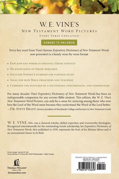 Study the meaning of biblical words in the original languages without spending years learning Greek. W. E. Vine's New Testament Word Pictures places every key word from Vine's classic Expository Dictionary of New Testament Words in Bible book and verse-by-verse order. The text of the King James Version of the Bible is included for context, but W. E. Vine's New Testament Word Pictures is keyed to the Strong's numbering system and can be used with any Bible translation. W. E. Vine's New Testament Word Pictures: Explains key words in original Greek context Does not require knowledge of Greek Includes Strong's numbers for further study Is ideal for busy Bible preachers and teachers Combines the features of a dictionary, concordance, and commentary