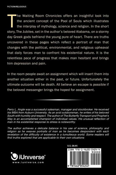 The Waiting Room Cronicles offers an insightful look into the ancient concept of the Pool of Souls which illustrates the interplay of mythology, science and religion. In the short story, The Jubilee, set in the author's beloved Alabama, on a stormy day Greek gods befriend the young pure of heart. There are truths uncovered in these pages which reflect a portrait of man that changes with the political, environmental, and religious upheaval that daily forces man to confront his existential nature. It is the relentless pace of progress that makes man hessitant and brings him depression and pain. In the room people await an assignment which will interject them into another situation either in the past, or future. Unfortunately, the ultimate outcome will be death. All believe an escape is possible if the beloved messenger brings the hoped for assissigment.