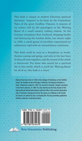 This book is unique in modern christian spiritual literature. Inspired in its form by the Canterbury Tales of the great Geoffrey Chaucer, it consists of six stories told by the passengers in the 'Waiting Room'of a small country railway station. As the German aerpolanes flew overhead, dropping bombs and destroying the London docks, one winter night in 1940, a small group of travellers experinced an unforeseen vigil with an extraordinary conclusion. This book could be seen as a Symphony in words, themes coming and going, and only at the last lines do they all come together, and the reason of the whole is discovered. For those who search for a spiritual life in this world, which is itself the Waitng 'Room' for all of us, this book is a 'must.' Bishop Paul was born in 1942 in the village of Hollesley, on the Suffolk coast. He studied at the St.Sergius Orthodox Theological Institute in Paris. Ordained a priest in 1967, he served in Russian 'émigré' parishes in the Paris suburbs. In 1991 he was elected by the Holy Synod of the Oecumenical Patriachate Bishop with the title of the ancient Byzantine city of Tracheia. Having served for ten years as a Bishop in the South of France, he retired to live a secluded life. He has presently published thirteen volumes of spiritual poetry.