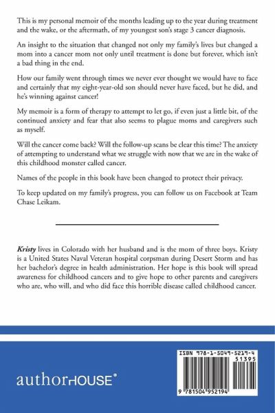 This is my personal memoir of the months leading up to the year during treatment and the wake, or the aftermath, of my youngest son's stage 3 cancer diagnosis. An insight to the situation that changed not only my family's lives but changed a mom into a cancer mom not only until treatment is done but forever, which isn't a bad thing in the end. How our family went through times we never ever thought we would have to face and certainly that my eight-year-old son should never have faced, but he did, and he's winning against cancer! My memoir is a form of therapy to attempt to let go, if even just a little bit, of the continued anxiety and fear that also seems to plague moms and caregivers such as myself. Will the cancer come back? Will the follow-up scans be clear this time? The anxiety of attempting to understand what we struggle with now that we are in the wake of this childhood monster called cancer. Names of the people in this book have been changed to protect their privacy. To keep updated on my family's progress, you can follow us on Facebook at Team Chase Leikam.