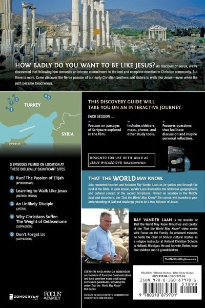 Experience how the disciples translated Jesus' call to passionate discipleship into language and imagery that the Roman culture would understand. In the seventh volume of the series That The World May Know, take a tour through the land of the Bible--visiting places such as Aphrodisias, Antioch Pisidia, Lystra, and Cappadocia--and understand the Bible's fascinating historical, cultural, religious, and geographical contexts in whole new way. This discovery guide includes passages of Scripture explored in the DVD (sold separately); questions for discussion and personal reflection; personal Bible studies to help you deepen your learning experience between sessions; as well as sidebars, maps, photos, and other study tools. Lessons include: Run! The Passion of Elijah - Filmed in Aphrodisias Learning to Walk Like Jesus - Filmed in Antioch Pisidia An Unlikely Disciple - Filmed in Lystra Why Christians Suffer: The Weight of Gesthemane - filmed in Cappadocia Don't Forget Us - filmed on location in Cappadocia Designed for use with the Walk As Jesus Walked Video Study (sold separately). _______________ THAT THE WORLD MAY KNOW Join renowned teacher and historian Ray Vander Laan as he guides you through the land of the Bible. In each lesson, Vander Laan illuminates the historical, geographical, and cultural context of the sacred Scriptures. Filmed on location in the Middle East and elsewhere, the That the World May Know film series will transform your understanding of God and challenge you to be a true follower of Jesus.