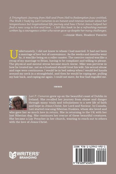 A Triumphant Journey from Hell and From Hell to Redemption [now entitled, The Walk I Took] by Lori Cameron is an honest and intense memoir about her tempestuous but inspirational life journey and how Christ Jesus helped her find a new way to live and love... I felt this book to be a refreshing memoir written by a courageous writer who never gave up despite her many challenges. - Jennie More, Readers' Favorite Book synopsis:Unfortunately, I did not know to whom I had married. It had not been a marriage of love but of convenience. As the weeks and months went by, it was like being on a roller coaster. The coercive control was like a recap of my marriage to Brian, having to be compliant and willing to please. The physical and mental stress became much worse. Mike was perverse in how he treated me, not as a husband should treat his wife; his sexual abuse and rape were continuous. I would be in bed asleep when I would feel hands around my neck in a stranglehold, and then he would be raping me, pulling my hair back, and raping me again. I could not move, for fear had engulfed me. ¿¿Autobiography:Lori P. Cameron grew up on the beautiful coast of Dublin in Ireland. She recalled her journey from abuse and danger through many trials and tribulations to a new life of faith and hope in Jesus Christ, her Lord and Saviour. In Canada, Lori started rescuing Siberian Huskies, whom she loved and who gave her so much love in return. She is returning to the UK with her last Siberian dog. She continues her rescue of these beautiful creatures. She became a Lay Preacher in her church, wanting to reach out to others with the love of Jesus Christ.