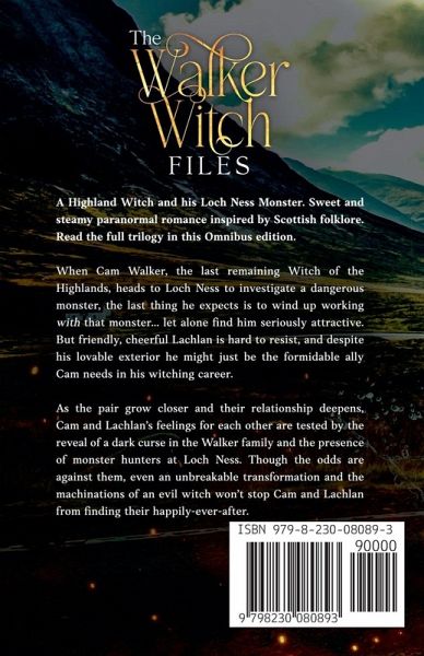 A Highland Witch and his Loch Ness Monster. Sweet and steamy MM paranormal romance inspired by Scottish folklore. Read the full trilogy in this Omnibus edition. When Cam Walker, the last remaining Witch of the Highlands, heads to Loch Ness to investigate a dangerous monster, the last thing he expects is to wind up working with that monster... let alone find him seriously attractive. But friendly, cheerful Lachlan is hard to resist, and despite his lovable exterior he might just be the formidable ally Cam needs in his witching career. As the pair grow closer and their relationship deepens, Cam and Lachlan's feelings for each other are tested by the reveal of a dark curse in the Walker family and the presence of monster hunters at Loch Ness. Though the odds are against them, even an unbreakable transformation and the machinations of an evil witch won't stop Cam and Lachlan from finding their happily-ever-after. This Omnibus edition contains Books 1-3 of The Walker Witch Files: Finding Nessie, Hiding Nessie, and Saving Nessie.