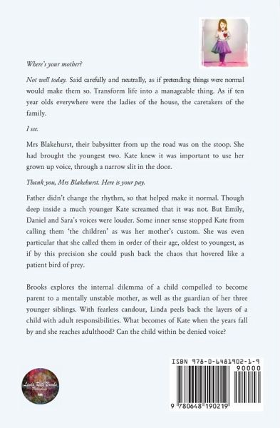 Where's your mother? Not well today. Said carefully and neutrally, as if pretending things were normal would make them so. Transform life into a manageable thing. As if ten year olds everywhere were the ladies of the house, the caretakers of the family. I see. Mrs Blakehurst, their babysitter from up the road was on the stoop. She had brought the youngest two. Kate knew it was important to use her grown up voice, through a narrow slit in the door. Thank you, Mrs Blakehurst. Here is your pay. Father didn't change the rhythm, so that helped make it normal. Though deep inside a much younger Kate screamed that it was not. But Emily, Daniel and Sara's voices were louder. Some inner sense stopped Kate from calling them 'the children' as was her mother's custom. She was even particular that she called them in order of their age, oldest to youngest, as if by this precision she could push back the chaos that hovered like a patient bird of prey. Brooks explores the internal dilemma of a child compelled to become parent to a mentally unstable mother, as well as the guardian of her three younger siblings. With fearless candour, Linda peels back the layers of a child with adult responsibilities. What becomes of Kate when the years fall by and she reaches adulthood? Can the child within be denied voice?