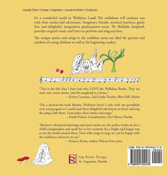 It's a wonderful world in Wallaboo Land! The wallaboos will enchant you with their stories and adventures. Imaginary friends, mystical journeys, goofy fun, and delightful, imaginative predicaments await. The Wallaboo Songbook, provides original music and lyrics to perform and sing anytime. The unique stories and songs in The Wallboos series are ideal for parents and teachers of young children as well as for beginning readers.