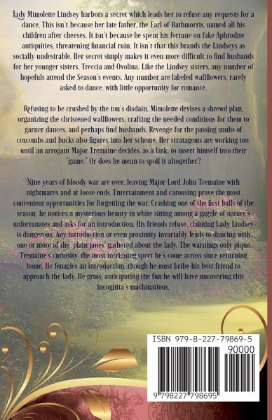 Lady Mimolette Lindsey harbors a secret which leads her to refuse any requests for a dance. This isn't because her late father, the Earl of Bathmorris, named all his children after French cheeses. It isn't because he spent his fortune on fake Aphrodite antiquities, threatening financial ruin. It isn't that this brands the Lindseys as socially undesirable. Her secret simply makes it even more difficult to find husbands for her younger sisters, Treccia and Ovolina. Like the Lindsey sisters, any number of hopefuls attend the Season's events. Any number are labeled wallflowers, rarely asked to dance, with little opportunity for romance. Refusing to be crushed by the ton's disdain, Mimolette devises a shrewd plan, organizing the christened wallflowers, crafting the needed conditions for them to garner dances, and perhaps find husbands. Revenge for the passing snubs of coxcombs and bucks also figures into her scheme. Her stratagems are working too, until an arrogant Major Tremaine decides, as a lark, to insert himself into their "game." Or does he mean to spoil it altogether? Nine years of bloody war are over, leaving Major Lord John Tremaine with nightmares and at loose ends. Entertainment and carousing prove the most convenient opportunities for forgetting the war. Crashing one of the first balls of the season, he notices a mysterious beauty in white sitting among a gaggle of nature's unfortunates and asks for an introduction. His friends refuse, claiming Lady Lindsey is dangerous. Any introduction or even proximity invariably leads to dancing with one or more of the 'plain janes' gathered about the lady. The warnings only pique Tremaine's curiosity, the most intriguing sport he's come across since returning home. He fenagles an introduction, though he must bribe his best friend to approach the lady. He grins, anticipating the fun he will have uncovering this incognita's machinations.