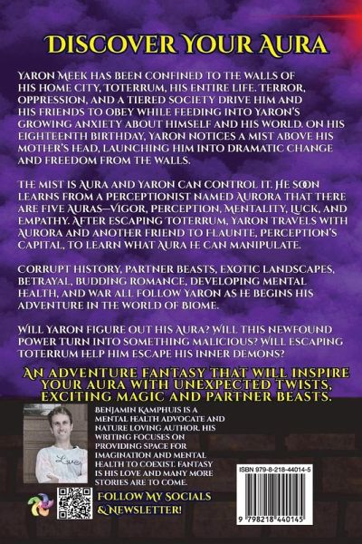 Yaron Meek has been confined to the walls of his home city, Toterrum, his entire life. Terror, oppression, and a tiered society drive him and his friends to obey while feeding into Yaron's growing anxiety about himself and his world. On his eighteenth birthday, Yaron notices a mist above his mother's head, launching him into dramatic change and freedom from the walls. The mist is Aura and Yaron can control it. He soon learns from a Perceptionist named Aurora that there are five Auras-Vigor, Perception, Mentality, Luck, and Empathy. After escaping Toterrum, Yaron travels with Aurora and another friend to Flaunte, Perception's capital, to learn what Aura he can manipulate. Corrupt history, partner beasts, exotic landscapes, betrayal, budding romance, developing mental health, and war all follow Yaron as he begins his adventure in the world of Biome. Will Yaron figure out his Aura? Will this newfound power turn into something malicious? Will escaping Toterrum help him escape his inner demons?