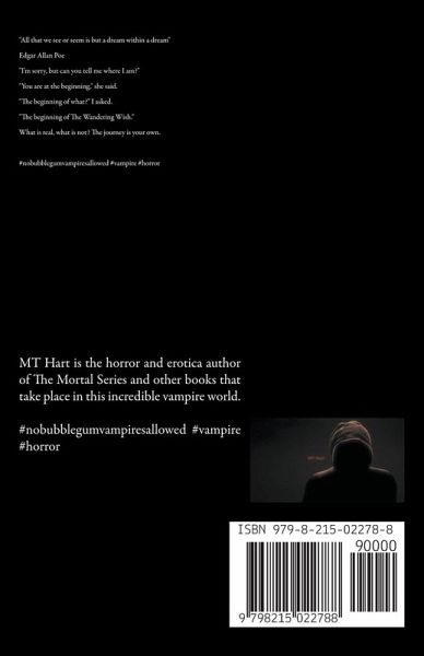 "All that we see or seem is but a dream within a dream" Edgar Allan Poe "I'm sorry, but can you tell me where I am?" "You are at the beginning," she said. "The beginning of what?" I asked. "The beginning of The Wandering Wish." What is real, what is not? The journey is your own. #nobubblegumvampiresallowed #vampire #horror