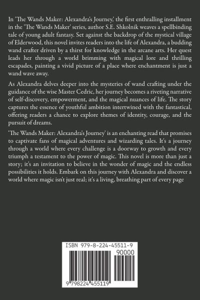 In 'The Wands Maker: Alexandra's Journey,' the first enthralling installment in the 'The Wands Maker' series, author S.E. Shkolnik weaves a spellbinding tale of young adult fantasy. Set against the backdrop of the mystical village of Elderwood, this novel invites readers into the life of Alexandra, a budding wand crafter driven by a thirst for knowledge in the arcane arts. Her quest leads her through a world brimming with magical lore and thrilling escapades, painting a vivid picture of a place where enchantment is just a wand wave away. As Alexandra delves deeper into the mysteries of wand crafting under the guidance of the wise Master Cedric, her journey becomes a riveting narrative of self-discovery, empowerment, and the magical nuances of life. The story captures the essence of youthful ambition intertwined with the fantastical, offering readers a chance to explore themes of identity, courage, and the pursuit of dreams. 'The Wands Maker: Alexandra's Journey' is an enchanting read that promises to captivate fans of magical adventures and wizarding tales. It's a journey through a world where every challenge is a doorway to growth and every triumph a testament to the power of magic. This novel is more than just a story; it's an invitation to believe in the wonder of magic and the endless possibilities it holds. Embark on this journey with Alexandra and discover a world where magic isn't just real; it's a living, breathing part of every page