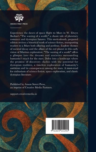 Experience the dawn of space flight to Mars in W. Elwyn Backus's "The waning of a world," a classic tale of planetary romance and dystopian futures. This meticulously prepared edition revives a historical work of science fiction, transporting readers to a Mars both alluring and perilous. Explore themes of societal decay and the allure of the red planet in this early vision of Martian exploration. "The waning of a world" offers a glimpse into the dreams and anxieties surrounding humanity's reach for the stars. Delve into a landscape where the promise of discovery clashes with the potential for dystopian realities, a timeless exploration of humanity's ambition and its consequences among the stars. A must-read for enthusiasts of science fiction, space exploration, and classic dystopian literature. This work has been selected by scholars as being culturally important, and is part of the knowledge base of civilization as we know it. This work is in the public domain in the United States of America, and possibly other nations. Within the United States, you may freely copy and distribute this work, as no entity (individual or corporate) has a copyright on the body of the work. Scholars believe, and we concur, that this work is important enough to be preserved, reproduced, and made generally available to the public. We appreciate your support of the preservation process, and thank you for being an important part of keeping this knowledge alive and relevant.