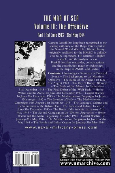 Captain Roskill has long been recognised as the leading authority on the Royal Navy's part in the Second World War. His Official History (originally published for the HMSO) is unlikely ever to be superseded. His narrative is highly readable, and the analysis is clear. Roskill describes sea battles, convoy actions and the contribution made by technology in the shape of ASDIC and Radar. Contents: Chronological Summary of Principal Events - The Background to the Maritime Offensive - The Battle of the Atlantic 1st June-31st August 1943 - The Bay of Biscay Offensive - The Battle of the Atlantic 1st September-31st December 1943 - The Final Defeat of the 'Wolf Packs' - Home Waters and the Arctic 1st June-31st December 1943 - Coastal Warfare 1st June-31st December 1943 - The Mediterranean Campaigns 1st June-15th August 1943 - The Invasion of Sicily - The Mediterranean Campaigns 16th August-31st December 1943 - The Landing at Salerno and the Submission of the Italian Fleet - The Pacific and Indian Oceans 1st June-31st December 1943 - The Battle of the Atlantic 1st January-31st May 1944 - The Second Campaign in the Western Approaches - Home Waters and the Arctic 1st January-31st May 1944 - Coastal Warfare 1st January-31st May 1944 - The Mediterranean Campaigns 1st January-31st May 1944 - The Pacific and Indian Oceans 1st January-31st May 1944
