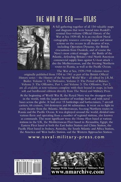 A full gathering together of all 154 valuable maps and diagrams that were bound into Roskill's seminal four-volume Official History of the War at Sea 1939-45. It is an excellent Naval cartography resource covering major and minor actions on the oceans in all theatres of war, including Operation Dynamo, the British evacuations from Dunkirk, and of course the Navy's most critical struggle - the Battle of the Atlantic, defending Britain's vital North American commercial supply lines against U-boat attack - also the Mediterranean, and the freezing Northern routes to Russia, as well as the Pacific Ocean. The War at Sea, 1939-1945 volumes were originally published from 1954 to 1961 as part of the British Official History series - the History of the Second World War - all edited by J.R.M. Butler. Volume 1: The Defensive, Volume 2: The Period of Balance, Volume 3: The Offensive, Part 1, and Volume 3: The Offensive, Part 2, are all available as text volumes complete with their bound in maps, in both soft and hardbound editions directly from The Naval and Military Press. At the beginning of World War II, the Royal Navy was the strongest navy in the world, with the largest number of warships built and with naval bases across the globe. It had over 15 battleships and battlecruisers, 7 aircraft carriers, 66 cruisers, 164 destroyers and 66 submarines. It went on to fight in every theatre from the Atlantic, Mediterranean, freezing Northern routes to Russia and the Pacific Ocean. It was deployed around the world, divided into various fleets and operating from a number of regional stations, also known as commands. The most significant were the Home Fleet based at various stations in the UK, the Mediterranean Fleet based in Alexandria, Egypt, the Eastern Fleet based at both the East Indies Station and China Station, the Pacific Fleet based in Sydney, Australia, the South Atlantic and Africa Station, the America and West Indies Station, and the Western Approaches Station.