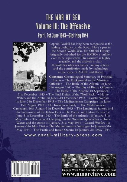 Captain Roskill has long been recognised as the leading authority on the Royal Navy's part in the Second World War. His Official History (originally published for the HMSO) is unlikely ever to be superseded. His narrative is highly readable, and the analysis is clear. Roskill describes sea battles, convoy actions and the contribution made by technology in the shape of ASDIC and Radar. Contents: Chronological Summary of Principal Events - The Background to the Maritime Offensive - The Battle of the Atlantic 1st June-31st August 1943 - The Bay of Biscay Offensive - The Battle of the Atlantic 1st September-31st December 1943 - The Final Defeat of the 'Wolf Packs' - Home Waters and the Arctic 1st June-31st December 1943 - Coastal Warfare 1st June-31st December 1943 - The Mediterranean Campaigns 1st June-15th August 1943 - The Invasion of Sicily - The Mediterranean Campaigns 16th August-31st December 1943 - The Landing at Salerno and the Submission of the Italian Fleet - The Pacific and Indian Oceans 1st June-31st December 1943 - The Battle of the Atlantic 1st January-31st May 1944 - The Second Campaign in the Western Approaches - Home Waters and the Arctic 1st January-31st May 1944 - Coastal Warfare 1st January-31st May 1944 - The Mediterranean Campaigns 1st January-31st May 1944 - The Pacific and Indian Oceans 1st January-31st May 1944