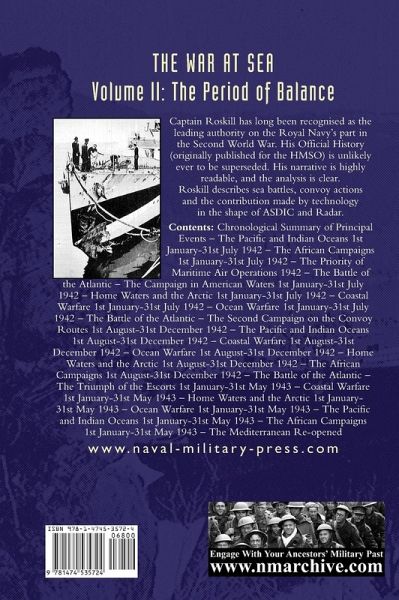 Captain Roskill has long been recognised as the leading authority on the Royal Navy's part in the Second World War. His Official History (originally published for the HMSO) is unlikely ever to be superseded. His narrative is highly readable, and the analysis is clear. Roskill describes sea battles, convoy actions and the contribution made by technology in the shape of ASDIC and Radar. Contents: Chronological Summary of Principal Events - The Pacific and Indian Oceans 1st January-31st July 1942 - The African Campaigns 1st January-31st July 1942 - The Priority of Maritime Air Operations 1942 - The Battle of the Atlantic - The Campaign in American Waters 1st January-31st July 1942 - Home Waters and the Arctic 1st January-31st July 1942 - Coastal Warfare 1st January-31st July 1942 - Ocean Warfare 1st January-31st July 1942 - The Battle of the Atlantic - The Second Campaign on the Convoy Routes 1st August-31st December 1942 - The Pacific and Indian Oceans 1st August-31st December 1942 - Coastal Warfare 1st August-31st December 1942 - Ocean Warfare 1st August-31st December 1942 - Home Waters and the Arctic 1st August-31st December 1942 - The African Campaigns 1st August-31st December 1942 - The Battle of the Atlantic - The Triumph of the Escorts 1st January-31st May 1943 - Coastal Warfare 1st January-31st May 1943 - Home Waters and the Arctic 1st January-31st May 1943 - Ocean Warfare 1st January-31st May 1943 - The Pacific and Indian Oceans 1st January-31st May 1943 - The African Campaigns 1st January-31st May 1943 - The Mediterranean Re-opened