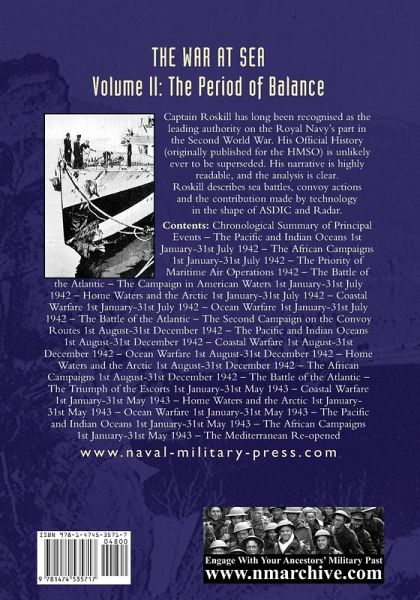 Captain Roskill has long been recognised as the leading authority on the Royal Navy's part in the Second World War. His Official History (originally published for the HMSO) is unlikely ever to be superseded. His narrative is highly readable, and the analysis is clear. Roskill describes sea battles, convoy actions and the contribution made by technology in the shape of ASDIC and Radar. Contents: Chronological Summary of Principal Events - The Pacific and Indian Oceans 1st January-31st July 1942 - The African Campaigns 1st January-31st July 1942 - The Priority of Maritime Air Operations 1942 - The Battle of the Atlantic - The Campaign in American Waters 1st January-31st July 1942 - Home Waters and the Arctic 1st January-31st July 1942 - Coastal Warfare 1st January-31st July 1942 - Ocean Warfare 1st January-31st July 1942 - The Battle of the Atlantic - The Second Campaign on the Convoy Routes 1st August-31st December 1942 - The Pacific and Indian Oceans 1st August-31st December 1942 - Coastal Warfare 1st August-31st December 1942 - Ocean Warfare 1st August-31st December 1942 - Home Waters and the Arctic 1st August-31st December 1942 - The African Campaigns 1st August-31st December 1942 - The Battle of the Atlantic - The Triumph of the Escorts 1st January-31st May 1943 - Coastal Warfare 1st January-31st May 1943 - Home Waters and the Arctic 1st January-31st May 1943 - Ocean Warfare 1st January-31st May 1943 - The Pacific and Indian Oceans 1st January-31st May 1943 - The African Campaigns 1st January-31st May 1943 - The Mediterranean Re-opened