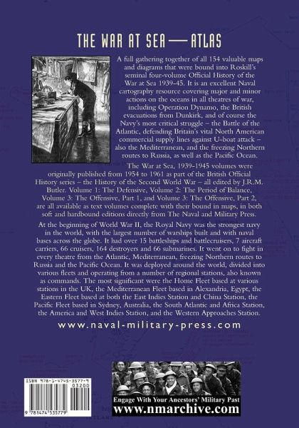 A full gathering together of all 154 valuable maps and diagrams that were bound into Roskill's seminal four-volume Official History of the War at Sea 1939-45. It is an excellent Naval cartography resource covering major and minor actions on the oceans in all theatres of war, including Operation Dynamo, the British evacuations from Dunkirk, and of course the Navy's most critical struggle - the Battle of the Atlantic, defending Britain's vital North American commercial supply lines against U-boat attack - also the Mediterranean, and the freezing Northern routes to Russia, as well as the Pacific Ocean. The War at Sea, 1939-1945 volumes were originally published from 1954 to 1961 as part of the British Official History series - the History of the Second World War - all edited by J.R.M. Butler. Volume 1: The Defensive, Volume 2: The Period of Balance, Volume 3: The Offensive, Part 1, and Volume 3: The Offensive, Part 2, are all available as text volumes complete with their bound in maps, in both soft and hardbound editions directly from The Naval and Military Press. At the beginning of World War II, the Royal Navy was the strongest navy in the world, with the largest number of warships built and with naval bases across the globe. It had over 15 battleships and battlecruisers, 7 aircraft carriers, 66 cruisers, 164 destroyers and 66 submarines. It went on to fight in every theatre from the Atlantic, Mediterranean, freezing Northern routes to Russia and the Pacific Ocean. It was deployed around the world, divided into various fleets and operating from a number of regional stations, also known as commands. The most significant were the Home Fleet based at various stations in the UK, the Mediterranean Fleet based in Alexandria, Egypt, the Eastern Fleet based at both the East Indies Station and China Station, the Pacific Fleet based in Sydney, Australia, the South Atlantic and Africa Station, the America and West Indies Station, and the Western Approaches Station.